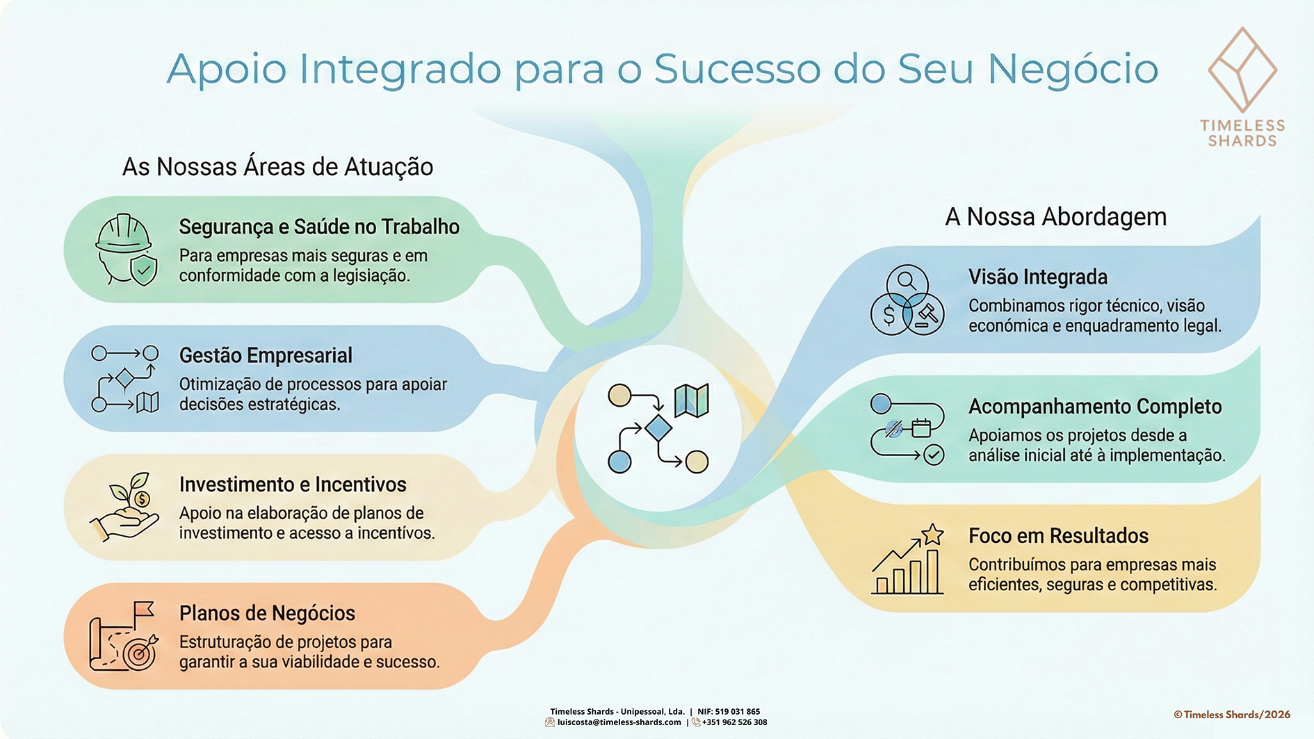 Atuamos de forma integrada nos domínios da Segurança e Saúde no Trabalho, gestão empresarial, planos de investimento, sistemas de incentivos regionais e nacionais e elaboração de planos de negócios, assegurando soluções ajustadas à realidade e aos objetivos de cada cliente.
